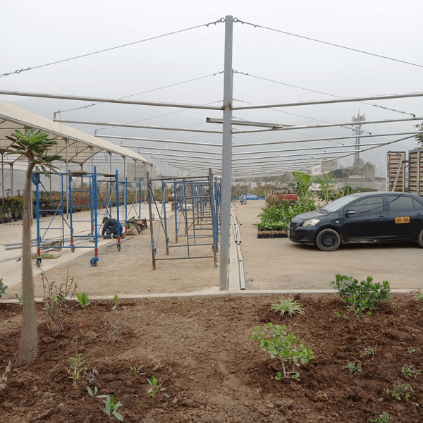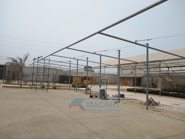 Fabricación y montaje de techo con estructura metálica y tensores para estacionamiento vehicular.